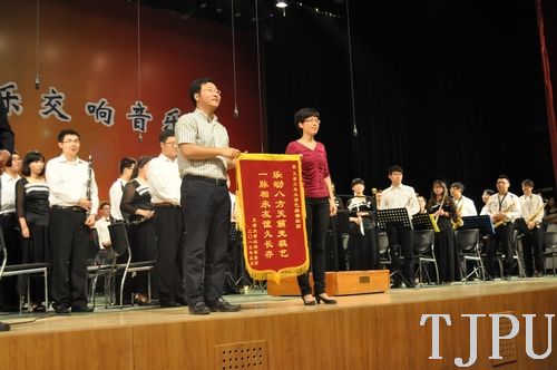 天津大学团委副书记王开还向我校艺缘艺术团赠送了锦旗,祝愿两校友谊地久天长。