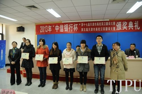 据了解,大赛从2013年5月开始,初赛收到来自天津市属高校、高职院校、独立院校、在津部队院校以及河北在津院校共计26所高校专、本、研各个学历层次的参赛作品1300余件。经复赛阶段的激烈角逐,大赛共评选出一等奖4名、二等奖6名、三等奖10名、优秀奖21名。武警后勤学院等单位获得“优秀组织奖”、20余名教师获得“优秀指导教师”称号。其中,我校外国语学院学生在比赛中喜获佳绩:汉英翻译大赛方面,牛岩婷(指导教师马道山)获得二等奖,贺喜格太(指导教师王治国、甘美)、郭丹东(指导教师赵秀明、李华峰)获得三等奖,郗明月、李一妍获得优秀奖;梁叶、武宁和孙亚迪三名同学获得英汉翻译大赛优秀奖。外国语学院王治国老师获得“优秀指导教师”称号。本次举办的两大赛事是自天津市翻译大赛举办以来,参赛选手最多,学校来源最广,社会影响最大的一届大赛。本次大赛得到天津教委、天津市翻译协会的高度重视,中信银行天津市分行给予了大力支持。(编辑:宣传部 谢光勇)