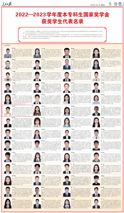 5月4日,《人民日报》整版刊登了《2022-2023学年度本专科生国家奖学金获奖学生代表名录》,天工学子伍泓冰脱颖而出,光荣上榜。