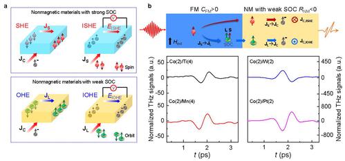 图1. (a)轨道霍尔效应、逆轨道霍尔效应、自旋霍尔效应和逆自旋霍尔效应的机制示意图。(b)基于逆轨道霍尔效应和逆自旋霍尔效应实现太赫兹发射的机制对比及Co/Ti、Co/Mn轻金属异质结和Co/W、Co/Pt重金属异质结的太赫兹发射谱