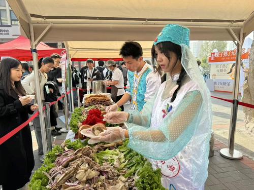 活动现场,人流如织、热闹非凡。津味八珍豆腐、北京烤鸭、内蒙古牛肉干、上海熏鱼、江西鸭三件、安徽酱板鸭、贵州折耳根、四川水煮鱼、广东白切鸡……江南的香甜软糯、川渝的鲜香麻辣、西北边陲的醇香厚重,中华大地的美食风情,在这里得到淋漓尽致地展现。同学们纷纷来到自己的家乡美食展区,或驻足点评、或试吃品尝,每一口都是对美好生活的致敬,都是对故乡味道的温柔回望。
