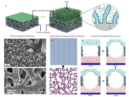 如何在聚哌嗪酰胺纳滤膜表面构建中空多级结构,一直以来是分离膜领域研究关键挑战。一方面,中空结构有助于增加单位膜面积的有效过滤面积,从而提升膜的水通量;另一方面,大幅调变膜表面结构对于深入理解界面聚合成膜机制具有重要意义。该研究提出了一种基于传统哌嗪与均苯三甲酰氯界面聚合体系的纳米管/纳米薄膜混合维度聚哌嗪酰胺膜结构。与传统平整表面的聚哌嗪酰胺膜相比,这种混合维度结构的纳滤膜水通量提升近4倍。受到植物内部导管毛细传输作用的启发,结合膜结构调控实验与分子动力学模拟结果,研究提出了界面聚合初期纳米孔网络毛细力诱导的纳米管自组织机制,初步揭示了界面聚合反应中界面物理化学相互作用在控制膜形貌跨尺度生长中的关键作用。该研究不仅提供了一种新颖的聚哌嗪酰胺纳滤膜结构,同时为界面聚合反应的调控提供了新的研究视角。