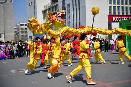 文艺展演中,舞龙表演率先登场,腾跃翻滚间尽显阳刚之美;天津霍元甲文武学校带来的武术展演刚柔并济,一招一式传递着自强不息的民族精神;“乐器张”第四代传人张雨执传统奚琴领奏,悠远琴音令全场屏息凝神;汉服社成员化身“十二花神”,衣袂翩跹间演绎四时芳菲的浪漫典故;中外学生联袂献唱的《上春山》,传递着中国传统节令的诗意欢愉;“一带一路”文化角内,留学生们体验剪纸、书法,用中文写下“我爱中国”。