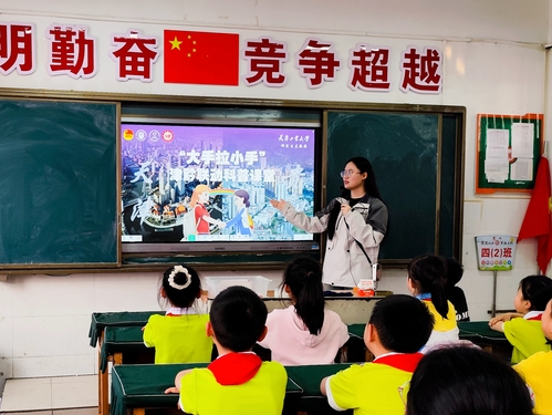 3月29日,西青区李七庄街高庄子社区、家贤里社区活动室里飘散着淡淡的艾草清香。艺术学院繁星志愿者们正手把手教孩子们用粘土制作“手工青团”。“先搓圆再压扁,用笔杆戳个小窝……”繁星志愿者们边说边教,桌上摆满了孩子们的作品,有的青团点缀着粉色“花瓣”,有的被捏成小兔子造型,一张写有“清明食春”的卡纸成了它们的“餐盘”。现场还穿插了“清明诗词接龙”,童声诵读与欢笑声交织。