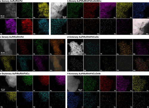 高熵合金作为一类特殊合金,通常由五种及以上金属元素按5%至35%的比例构成,其多元元素组合赋予了晶格畸变效应、缓慢扩散效应和鸡尾酒效应等独特特性,进而具备优异的催化活性、耐腐蚀性、热稳定性与化学稳定性。近年来,颗粒尺寸低于2nm的亚纳米级高熵合金因能大幅提升贵金属利用率,成为研究热点。然而,传统合成方法存在加热与冷却速率慢(每分钟仅数十摄氏度)的瓶颈,易导致合金相分离形成异质结构,还会引发纳米颗粒团聚;即便近年开发的焦耳热、微波加热法突破了部分热力学极限,仍难以制备出亚纳米级高熵合金。该研究精准解决了上述难题。他们先将金纳米颗粒分散在含多种金属盐的溶液中,再用纳秒脉冲激光对其辐照,借助激光激发的金纳米颗粒等离激元效应,使颗粒表面温度快速升至2000℃以上,并以高于1010℃/s的速度冷却,最终批量获得平均尺寸仅1.8nm、各元素均匀分布的亚纳米级高熵合金纳米颗粒。该合金作为电解水催化剂时,酸性条件下的产氢、产氧活性及稳定性,均显著优于商业铂碳催化剂与二氧化钌催化剂。